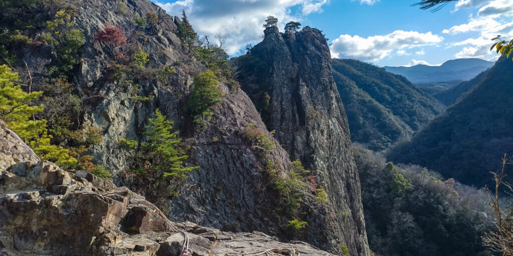 百丈岩は、船坂川の東岸に立烏帽子型で直立する巨岩で、高さは約60mにもなります。台状になった頂上は、百畳分ほどに広いという意味から百丈岩と名づけられたといわれています。また、百丈岩のすぐ下にあるのが鎌倉峡です。鎌倉時代に出家した北条時頼が、百丈岩に登って見事な鎌倉峡を愛でたので「鎌倉」という名が残ったといわれています。